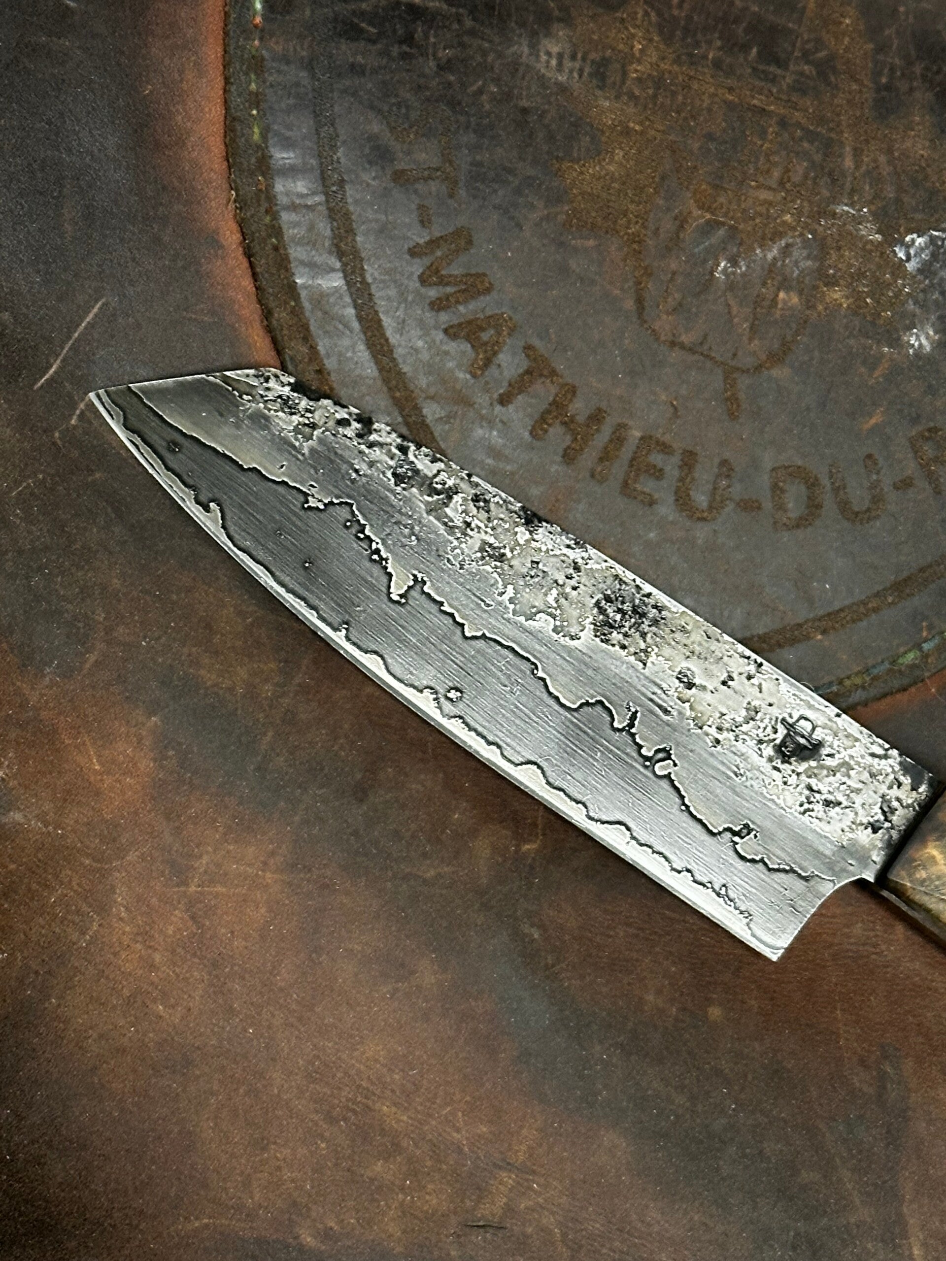 • La Lame : Construction San Mai complexe avec un cœur en acier 1095 pour un tranchant rasoir et durable, chemisé de 15N20. Le motif ondulé à la transition des aciers témoigne d'une maîtrise précise de la forge.